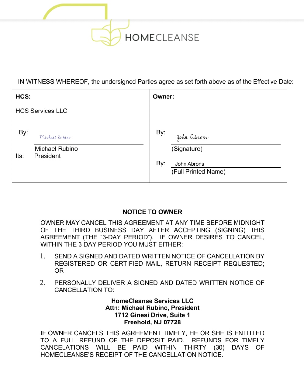 What’s curious (in my opinion) is that the contract was signed with HomeClease noting Michael Rubino as president and the address for HomeCleanse being